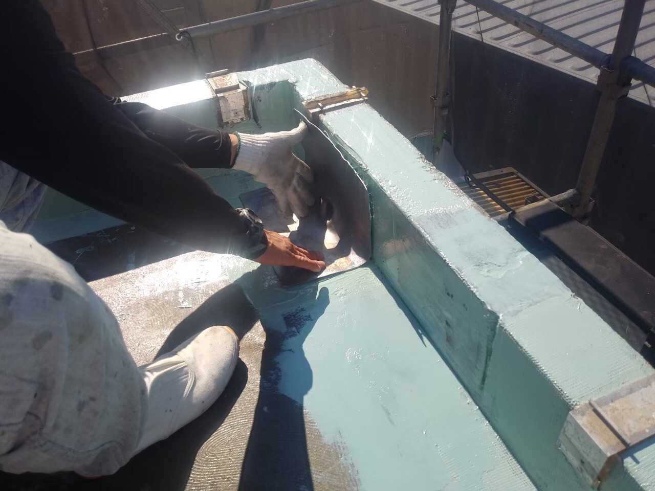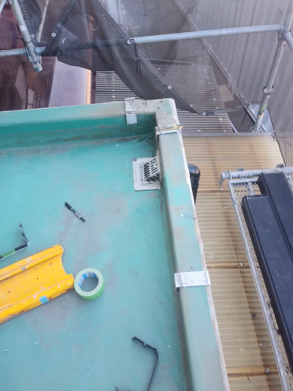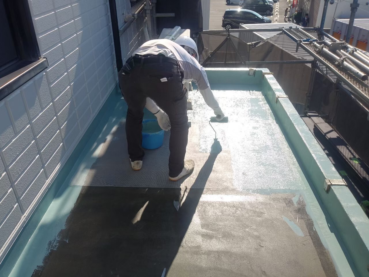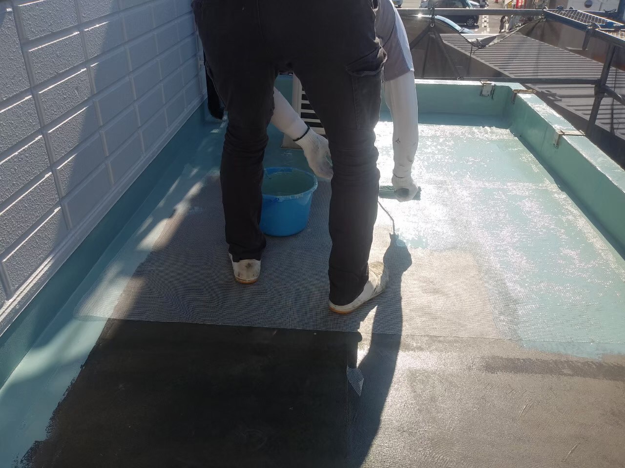 FRP防水は液状の不飽和ポリエステル樹脂に硬化剤を混合し、ガラス繊維などの補強材を組み合わせた塗膜防水工法の一つです。