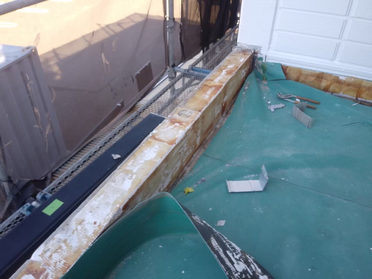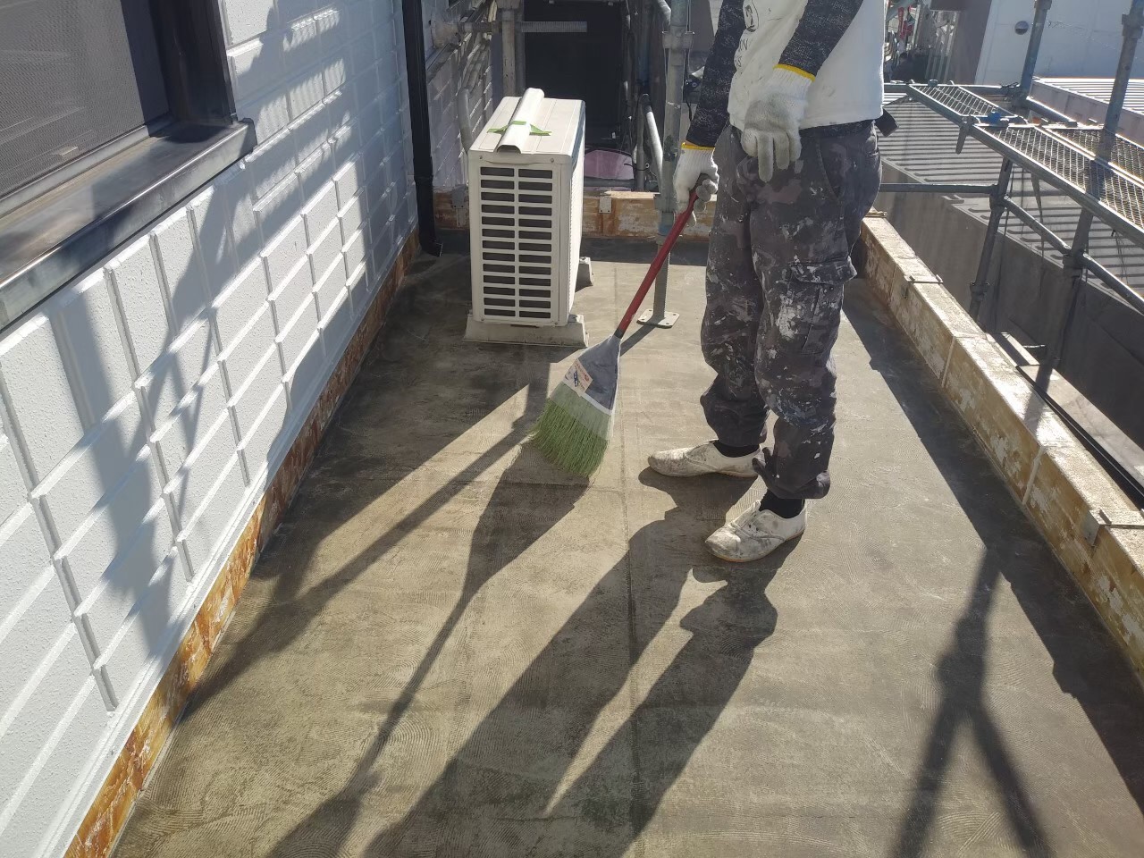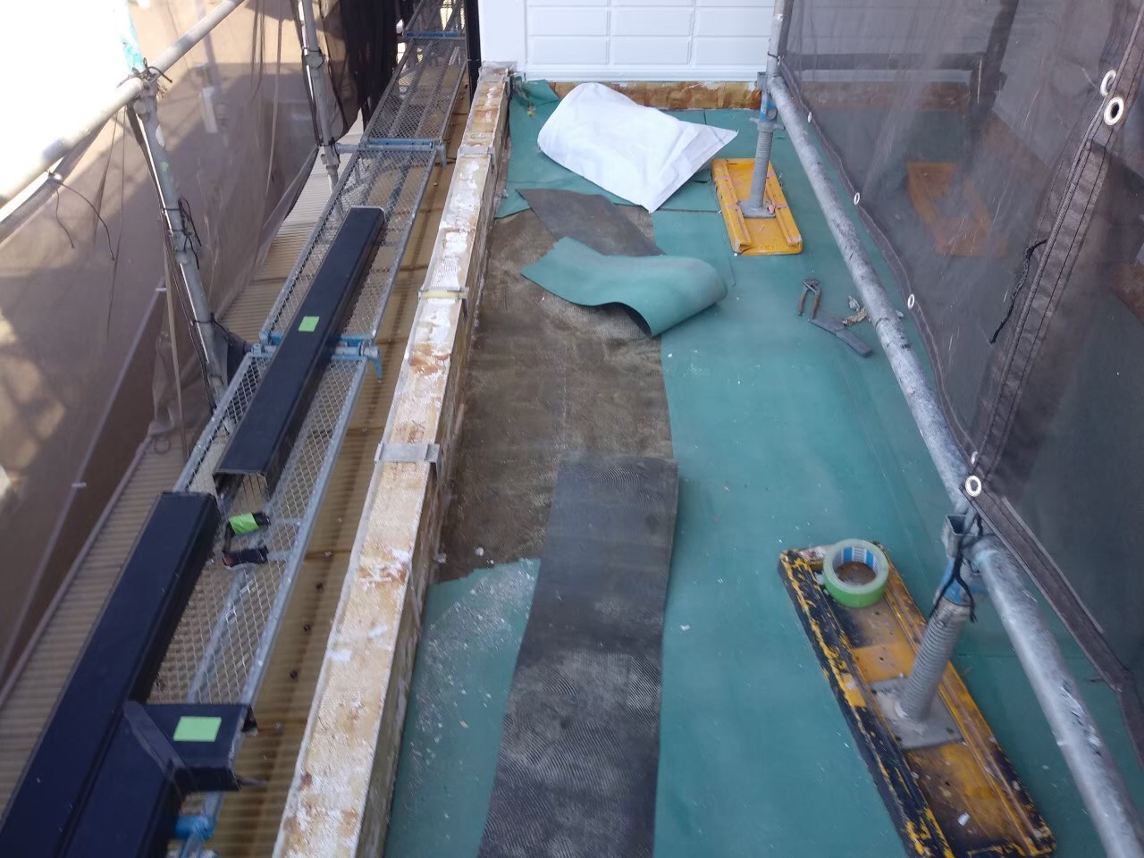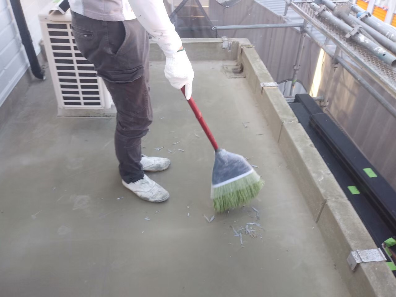 不要な防水シートをはがし、清掃、汚れがひどい場合は高圧洗浄で細かい汚れも一緒に落としていきます。