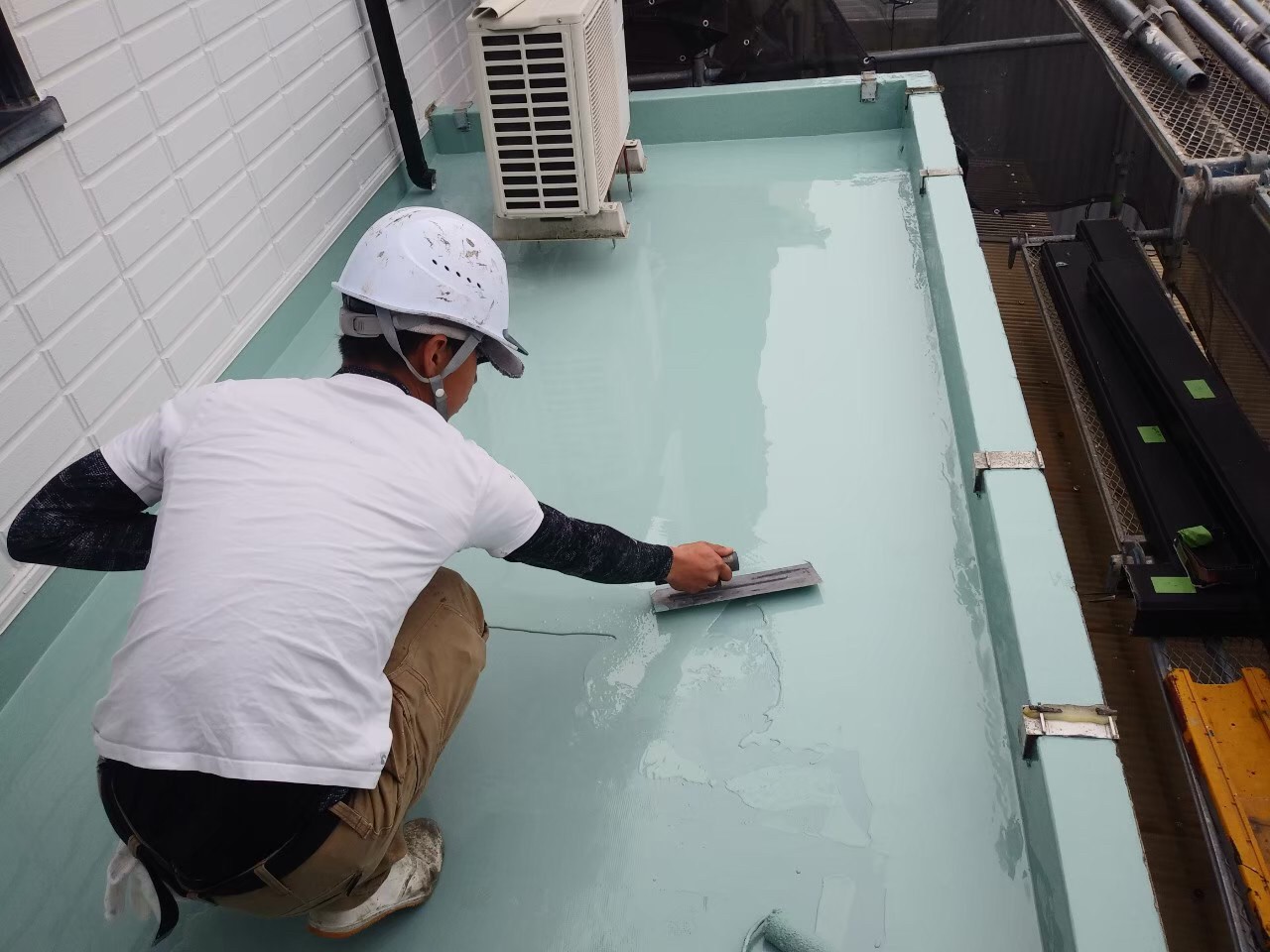 液体状のウレタン樹脂を複数回塗り重ねることで繋ぎ目のない防水層を形成し、雨水などの水分の浸入を防ぎます。